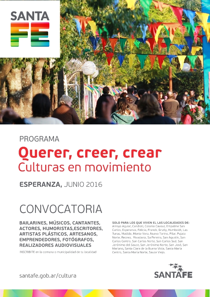 Para esta nueva edición del “Querer, Creer, Crear. Culturas en movimiento” fueron serán convocadas las localidades de Esperanza, Arroyo Aguiar, Candioti, Colonia Cavour, Empalme San Carlos, Felicia, Franck, Grutly, Humboldt, Las Tunas, Matilde, Monte Vera, Nuevo Torino, Pilar, Pujato Norte, Recreo, Rivadavia, Sa Pereyra, San Agustín, San Carlos Centro, San Carlos Norte, San Carlos Sud, San Jerónimo del Sauce, San Jerónimo Norte, San José, San Mariano, Santa Clara de la Buena Vista, Santa María Centro, Santa María Norte y Sauce Viejo.