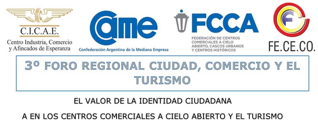 El Centro de Industria, Comercio y Afincados de Esperanza (CICAE), la Federación de Centros Comerciales de Santa Fe (FECECO) junto a la Federación Argentina de la Mediana Empresa (CAME) y la Federación Argentina de Centros Comerciales a Cielo Abierto (FCCA) invitan al3º Foro Regional Ciudad, Comercio y Turismo. Se llevará a cabo el Jueves 25 de Agosto de 09:30hs a 15:00hs en las instalaciones del CICAE, ciudad Esperanza – Aufranc 998.