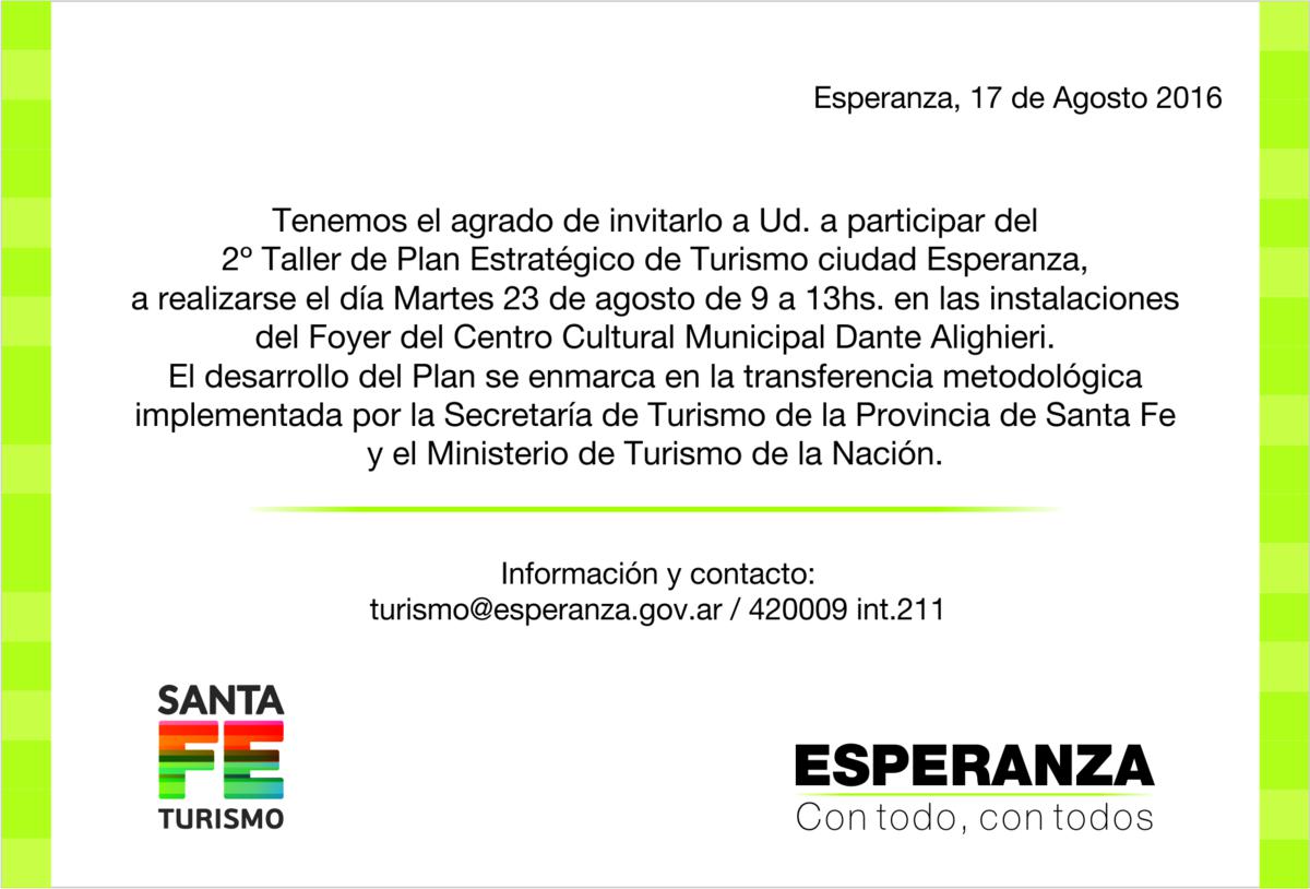 2º Taller del Plan Estratégico de Turismo ciudad de Esperanza, a realizarse el día martes 23 de agosto de 9 a 13 hs en las instalaciones del Foyer del Centro Cultural Municipal Dante Alighieri. El desarrollo del Plan se enmarca en la transferencia metodológica implementada por la Secretaria de Turismo de la Provincia de Santa Fe y el Ministerio de Turismo de la Nación.