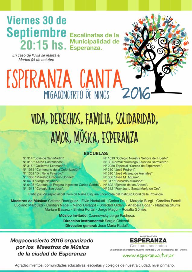 El día viernes 30 de septiembre a las 20:15 Hs en las escalinatas del Palacio Municipal se llevará a cabo un encuentro Coral organizado por los Maestros de Música de la ciudad de Esperanza llamado Megaconcierto de niños 2016 que convoca a los niños de nivel primario de las escuelas de la ciudad. El evento es organizado por los maestros de música de Esperanza con la Dirección General a cargo del Maestro José María Rudolf.