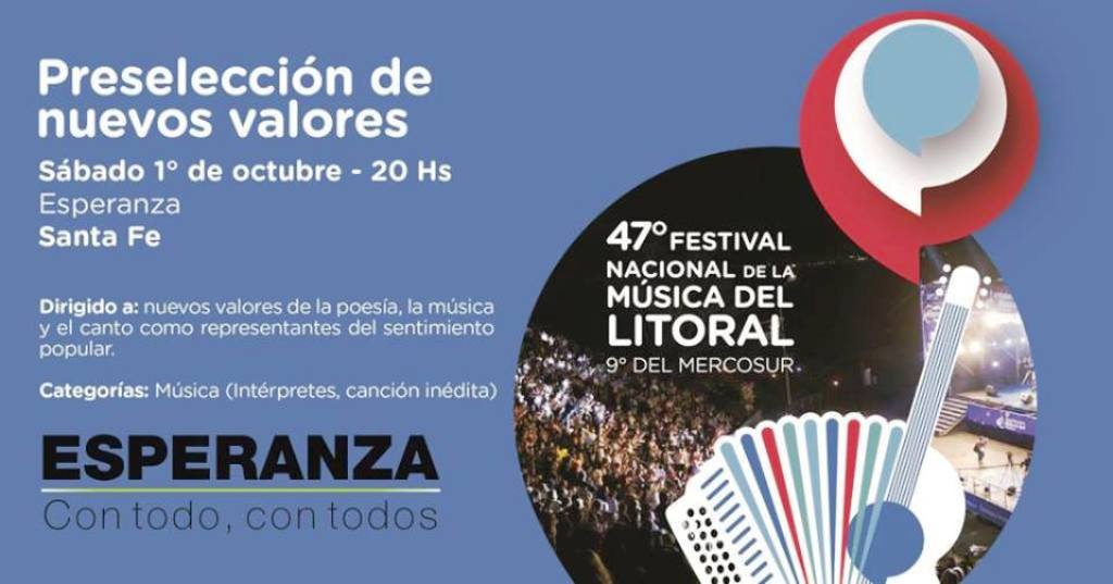 Abren la inscripción para participar -el sábado 1 de octubre- en la ciudad de Esperanza, del Pre Festival de Nuevos Valores del Litoral – Edición 2016La Municipalidad de Esperanza -a través de la Secretaría de Cultura y Deportes- informa a los artistas interesados, que se encuentra abierta la inscripción (con carácter totalmente gratuito) al Pre Festival de Nuevos Valores del Litoral – Edición 2016, 47º Festival Nacional de la Música del Litoral, y 9º del Mercosur, que se realizará el sábado 1 de octubre en las instalaciones del Centro Cultural Municipal “Dante Alighieri”.