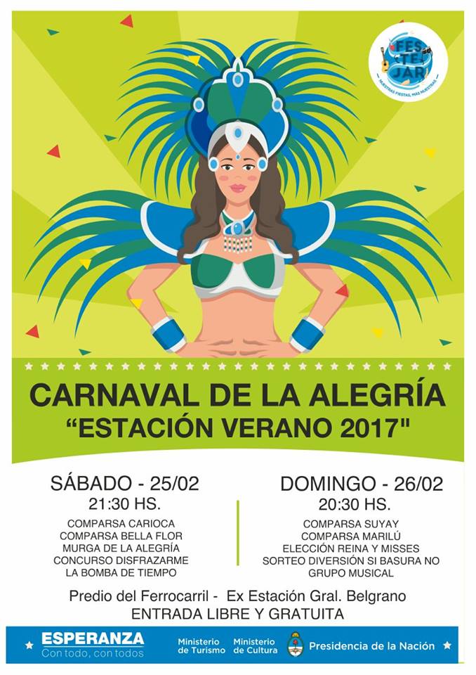 Prontos a la realización de los festejos de una nueva edición del “Carnaval de la Alegría” Estación Verano 2017 que se realizarán los próximos días 25 y 26 de febrero, frente a la Estación de Ferrocarril Gral. Belgrano, como se hace desde el año 2011 por 6º año consecutivo, sobre calle Dr. Gálvez en el tramo comprendido de Rivadavia a Moreno, se invita a concurrir especialmente, a todas las familias de Esperanza y de las localidades vecinas que deseen asistir a esta tradicional fiesta popular.