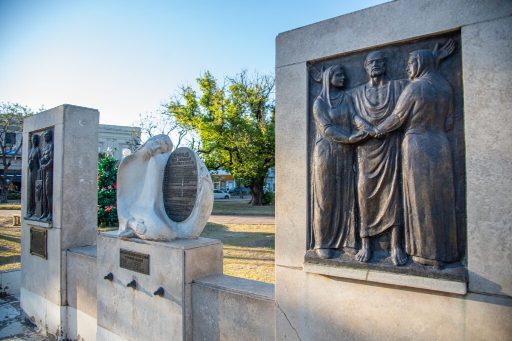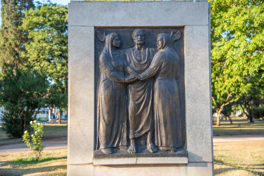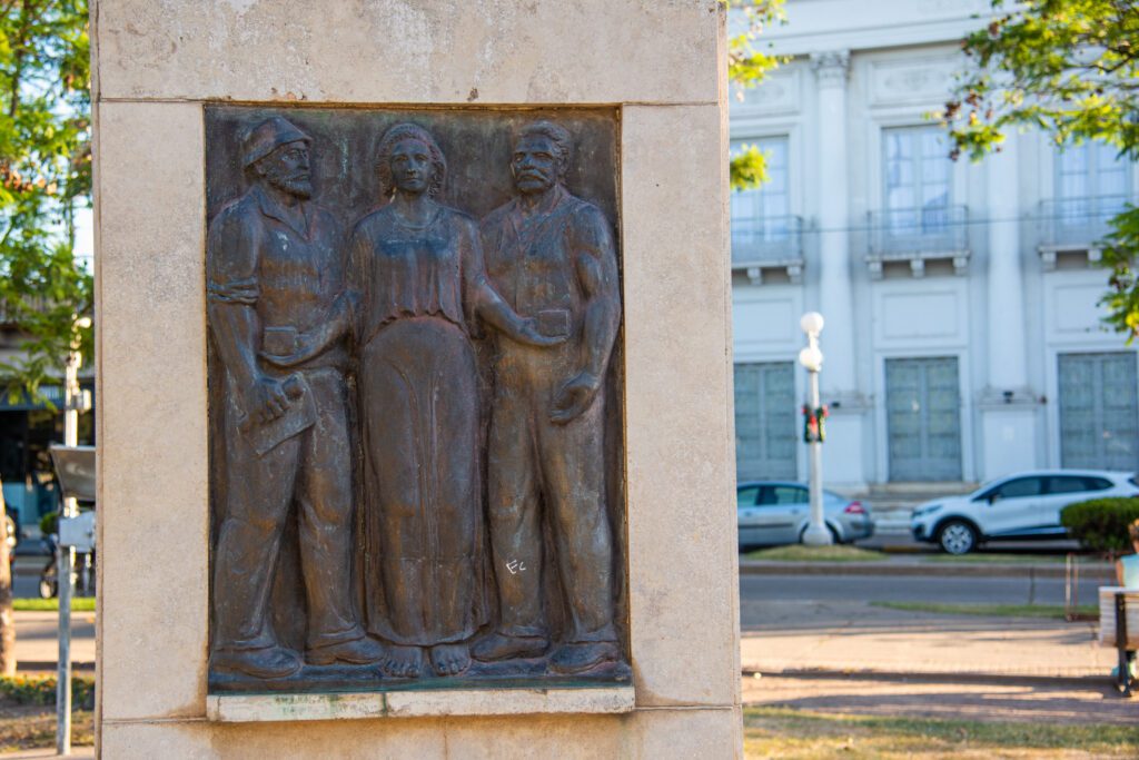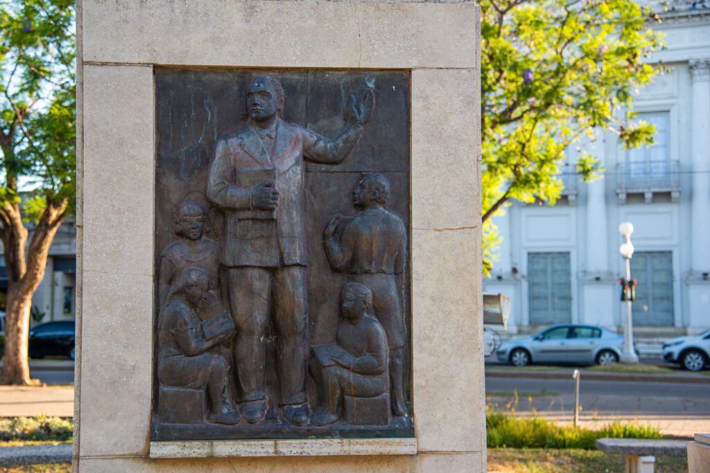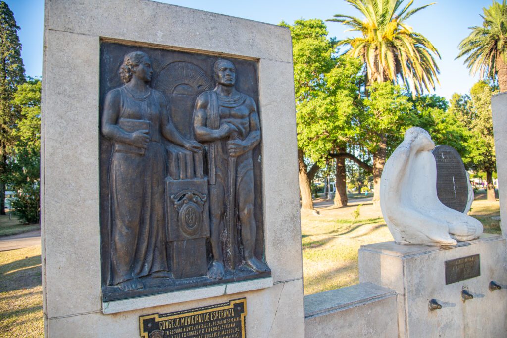 En la faz opuesta se representa “La subdivisión de la propiedad”, principio bajo el cual se instaló la Colonia en el año 1856. Allí, una figura central, con los brazos abiertos, hace entrega de la propiedad —la concesión de veinte cuadras cuadradas—, mientras que, a ambos lados, los labradores empuñan las herramientas destinadas a transformar la tierra en campo cultivado. El cuarto bajorrelieve constituye una representación conceptual de la educación primaria: el maestro, rodeado de niños, enseña las primeras letras, incorporando a la población infantil al ser nacional.