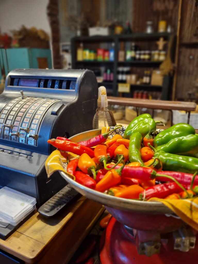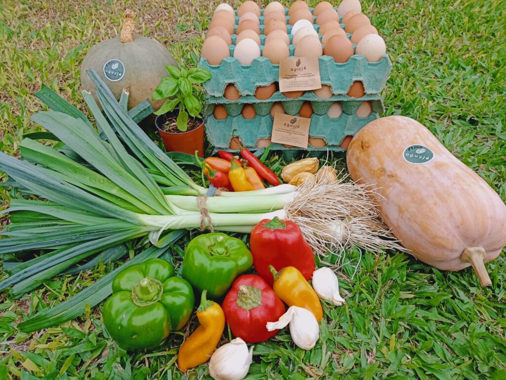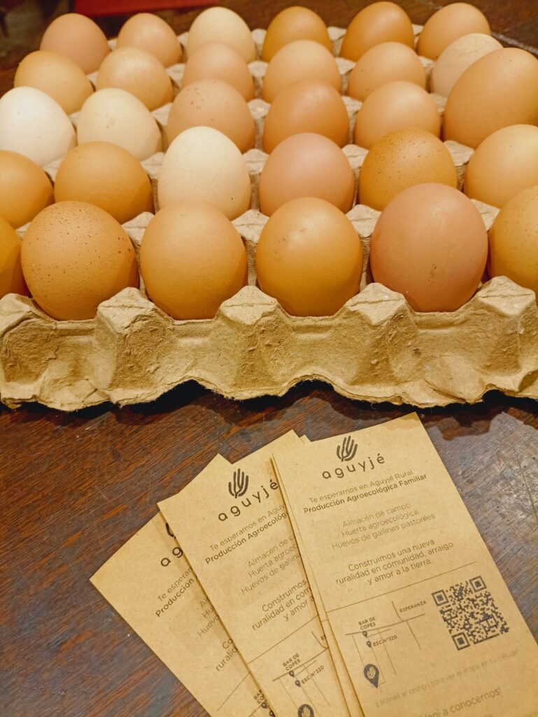 Huerta, huevos de gallinas en pastoreo, elaborados y almacén de campo.