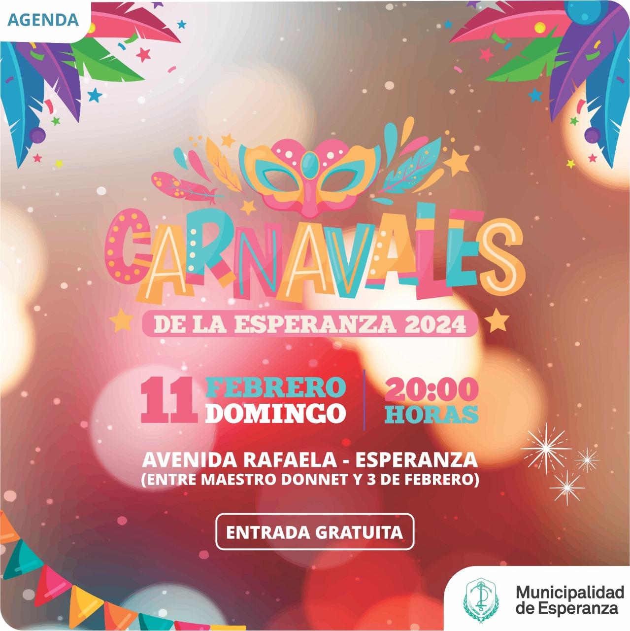 👉🏼 20 h: Carnavales de la Esperanza 2024. Comparsa “Patatín Patatán”, Cooperativa Circo del Litoral, Comparsa “Marilú”, Comparsa “Carioca”, Comparsa “Zumbae” San Agustín. Espectáculos musicales de José María Show y “La Groupera”. Artesanías, Gastronomía, juegos infantiles, y ¡mucho más! Entrada gratuita. Organiza: Municipalidad de Esperanza. En Parque de la Agricultura. Av. Rafaela entre calles Maestro Donnet y 3 de Febrero.