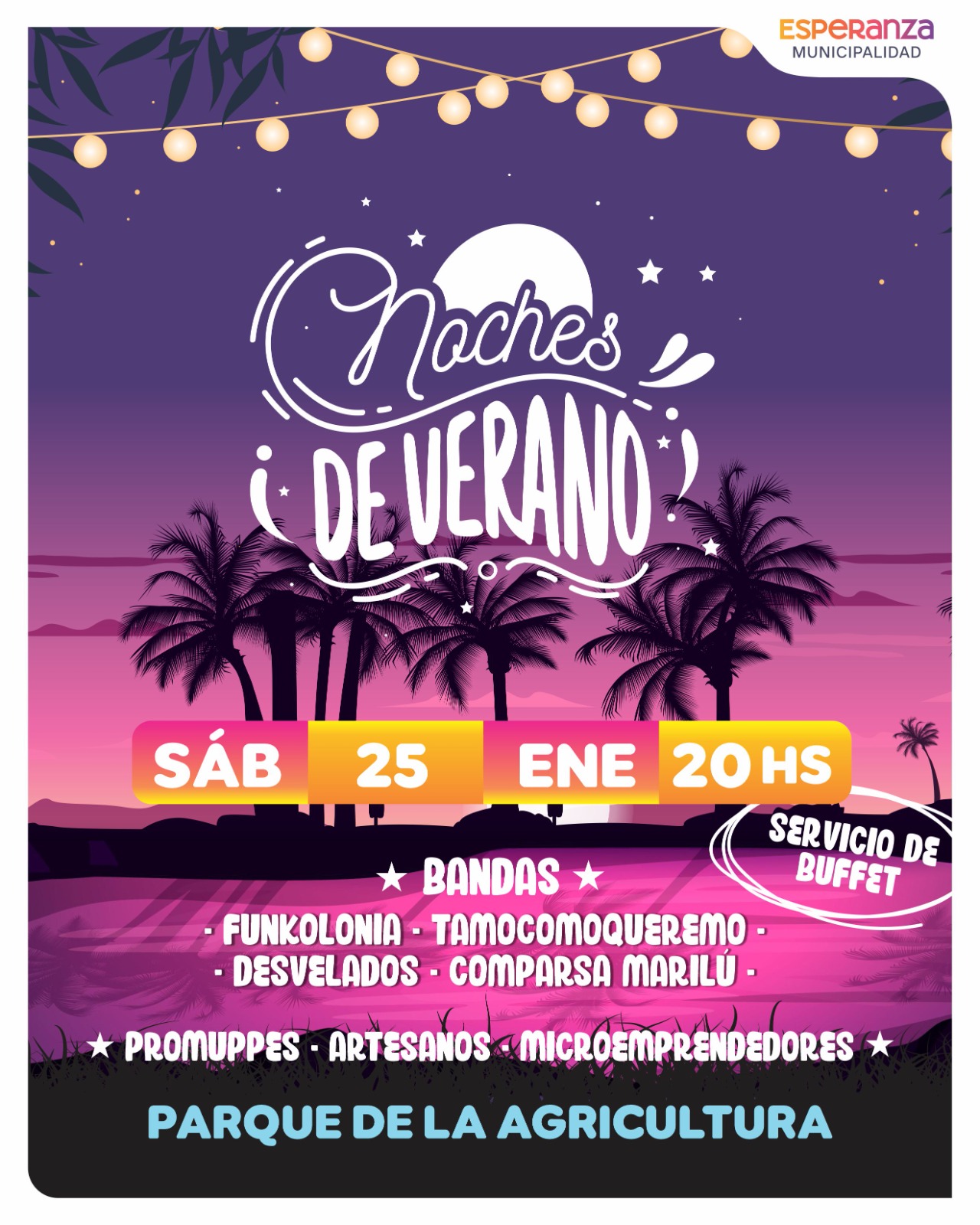 👉 20 h: 🌟 ¡Noches de Verano en el Parque de la Agricultura! 🌟 Música en vivo: Funkolonia, Tamocomoqueremo, Desvelados, Comparsa Marilú. Servicio de Buffet. Feria de ProMuPpe, artesanos y microemprendedores. En el Parque de la Agricultura.