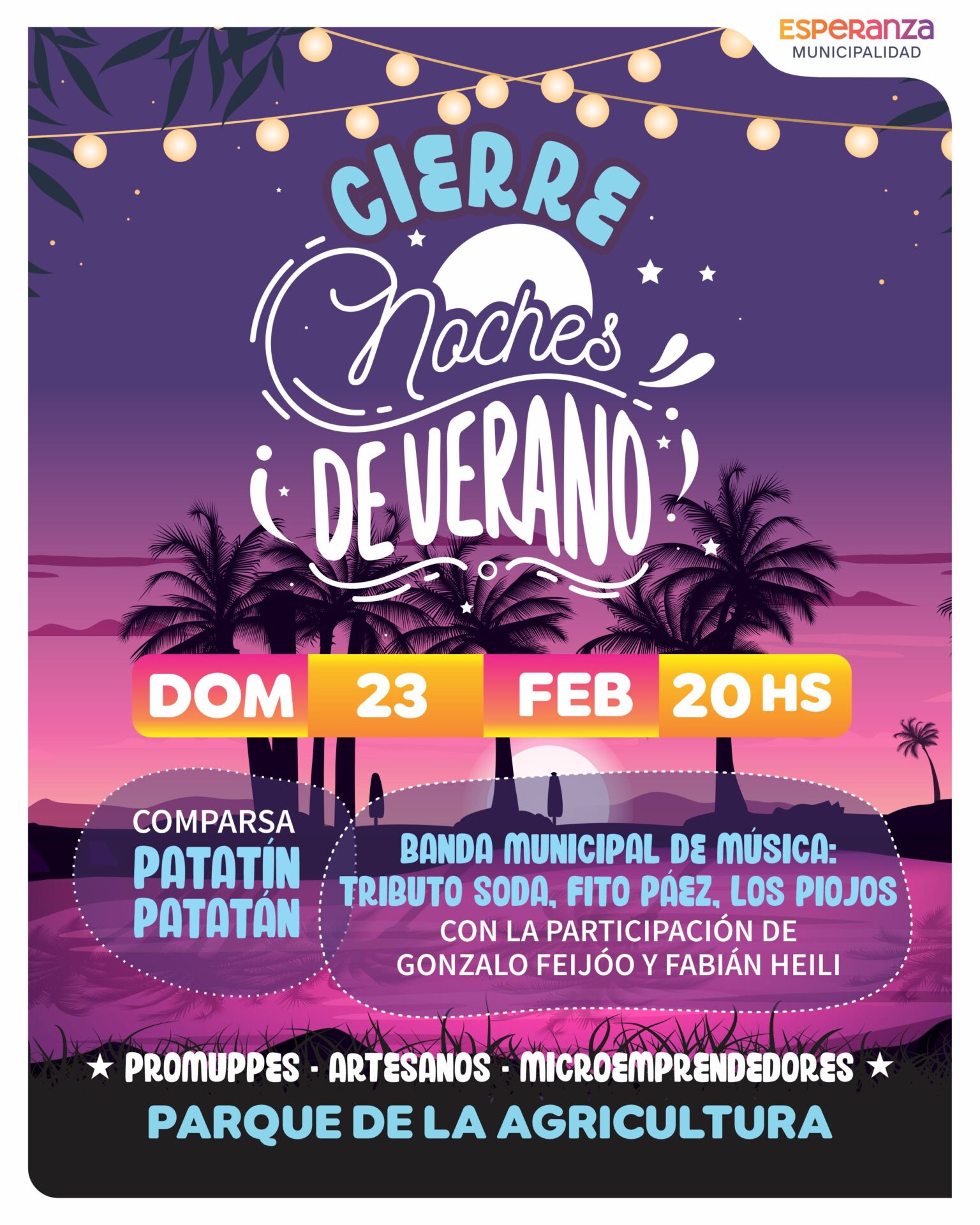 👉 20 h: 🌜 Cierre Noches de Verano 🌜 : Banda Municipal de Música Tributo Soda Stereo, Fito Páez, Los Piojos, con la participación de Gonzalo Feijóo en voz y Fabián Heili en guitarra. Comparsa Patatín Patatán. En el Parque de la Agricultura.
