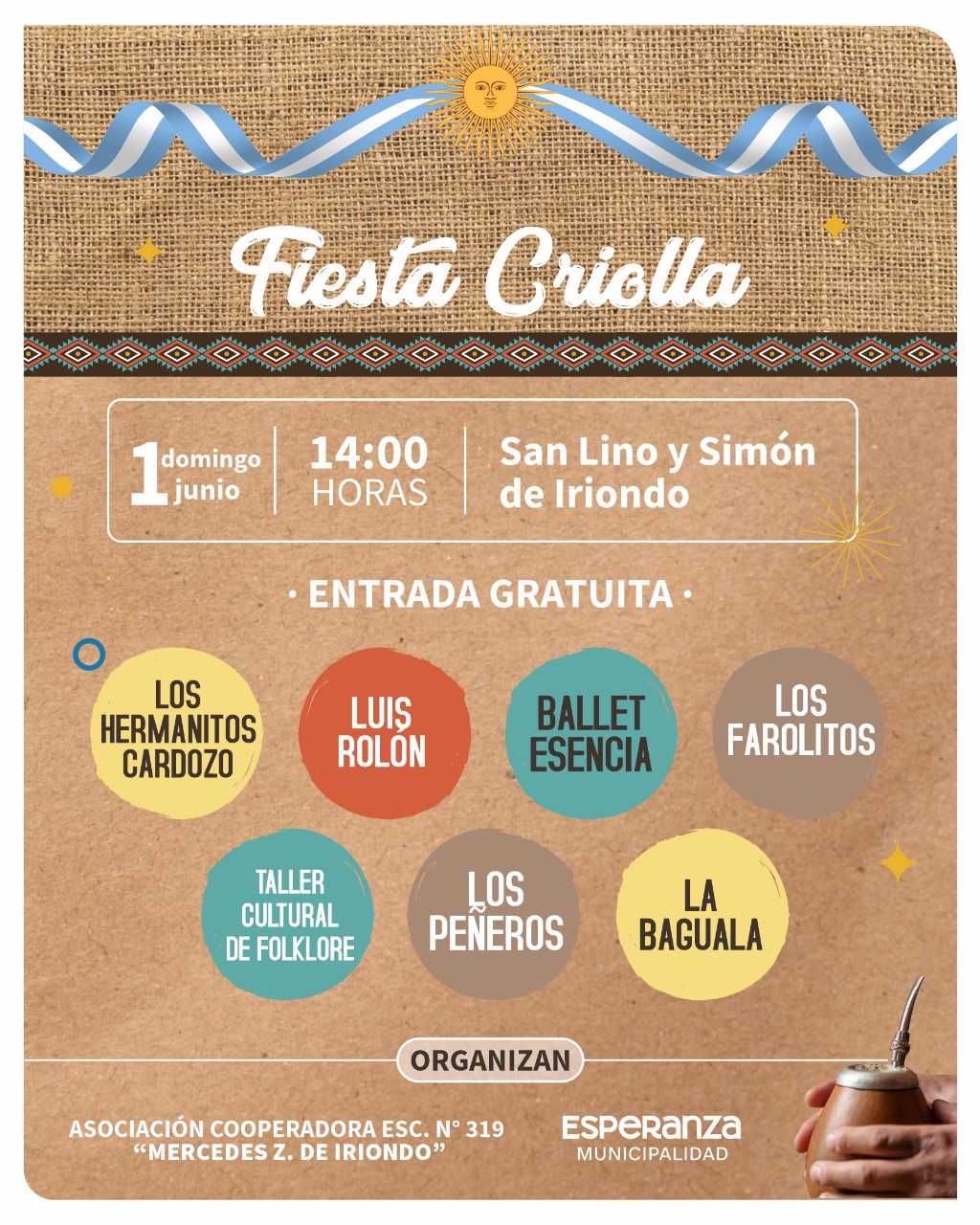 👉 14 h: “Fiesta Criolla”. Destrezas criollas, espectáculos artísticos y comidas típicas. Se presentarán: Taller Cultural de Folklore, Los Peñeros, La Baguala, Luis Rolón, Los hermanitos Cardozo, Ballet Escencia, Los Farolitos. Organiza: Asociación Cooperadora Esc. Nº 319 “Mercedes Z. de Iriondo” y Municipallidad de Esperanza. Entrada gratuita En barrio La Orilla, San Lino y S. de Iriondo.