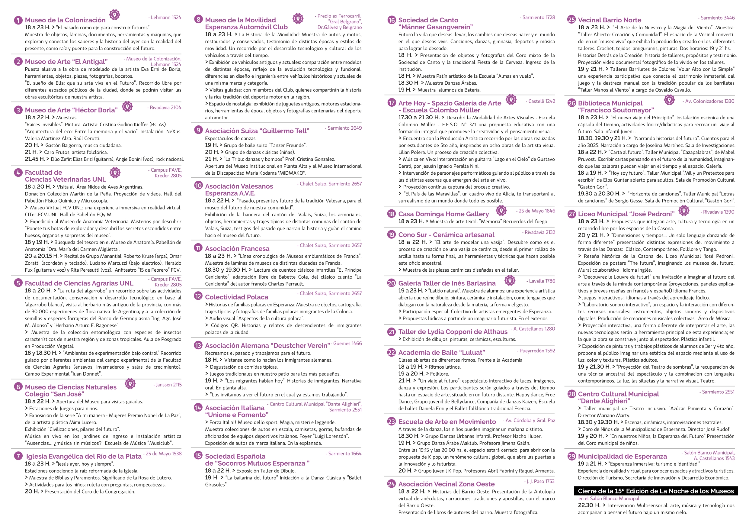 Este año participarán del evento las siguientes instituciones y espacios culturales: Municipalidad de Esperanza, Biblioteca Municipal «Francisco Soutomayor», Liceo Municipal «José Pedroni», Centro Cultural Municipal «Dante Alighieri», Museo de la Colonización, Museo de Arte «El Antigal», Museo de Arte «Héctor Borla», Facultad de Ciencias Veterinarias de la UNL, Facultad de Ciencias Agrarias de la UNL, Museo de Ciencias Naturales del Colegio San José, Iglesia Evangélica del Río de la Plata, Museo de la Movilidad Esperanza Automóvil Club, Asociación Suiza «Guillermo Tell», Asociación Valesanos Esperanza, Asociación Francesa, Colectividad Polaca, Asociación Alemana «Deutscher Veren», Asociación Italiana «Unione e Fomento», Sociedad Española de «Socorros Mutuos Esperanza», Sociedad de Canto «Männer Gesangverein», Arte Hoy – Spazio Galería de Arte, Casa Dominga Home Gallery, Cono Sur – Cerámica artesanal, Galería Taller de Inés Barlasina, Taller de Lydia Copponi de Althaus, Academia de Baile «Luluat», Escuela de Arte en Movimiento, Asociación Vecinal Oeste y Vecinal Barrio Norte.
