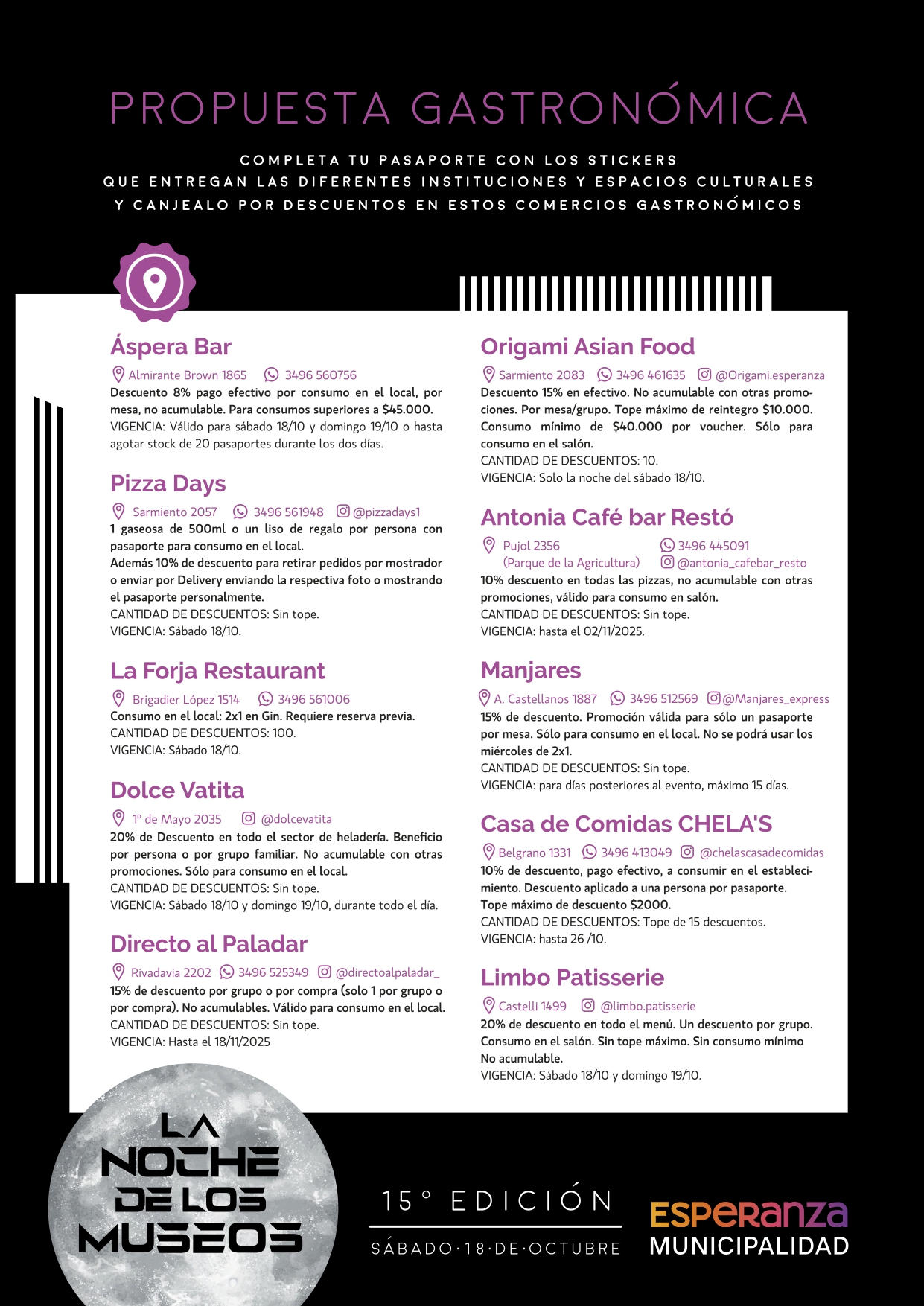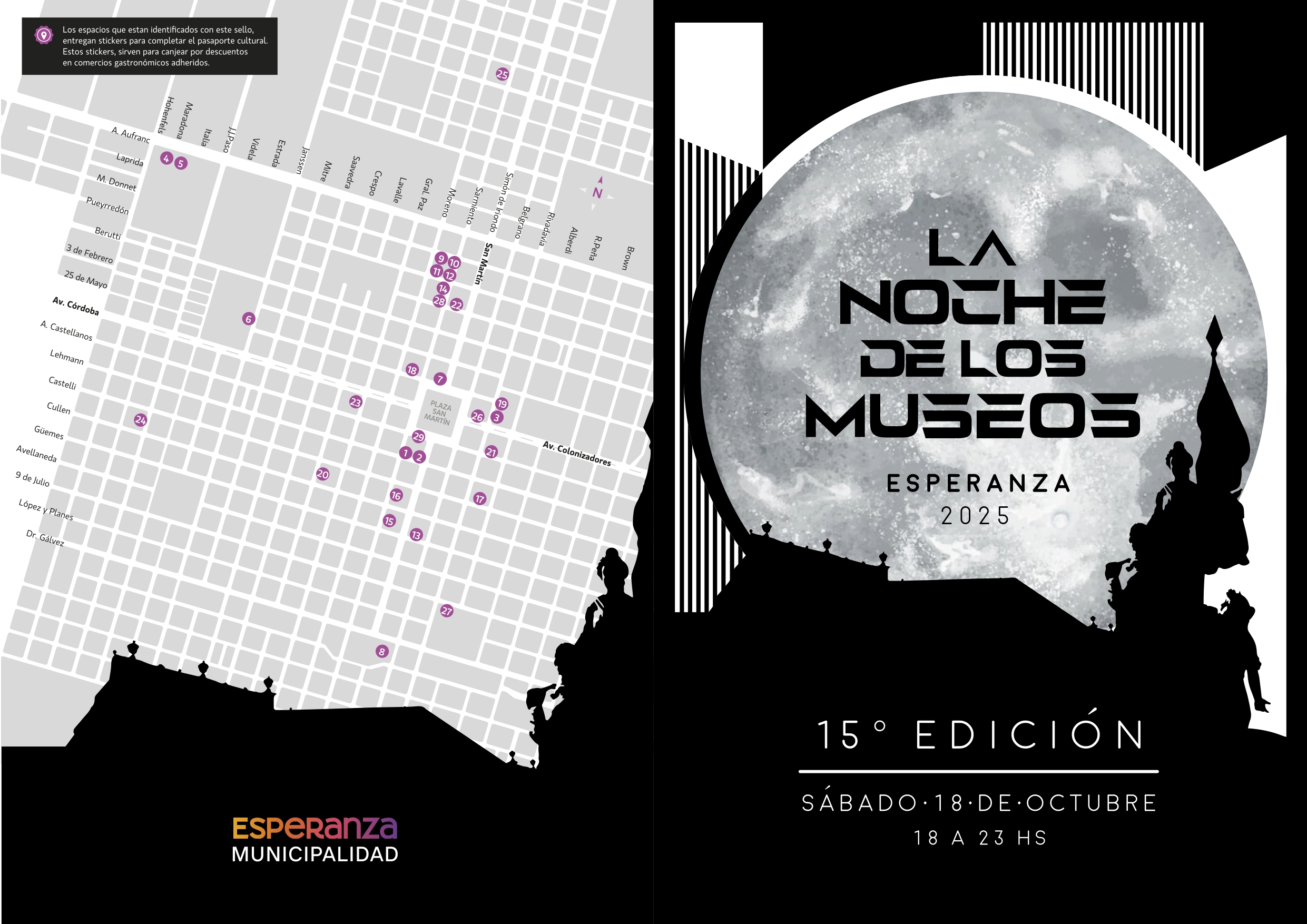 Durante la Noche de los Museos 2025, la Municipalidad de Esperanza impulsa el Pasaporte Cultural, una propuesta que invita a los visitantes a recorrer los espacios culturales de la ciudad y, como cierre de su experiencia, disfrutar beneficios en locales gastronómicos adheridos.