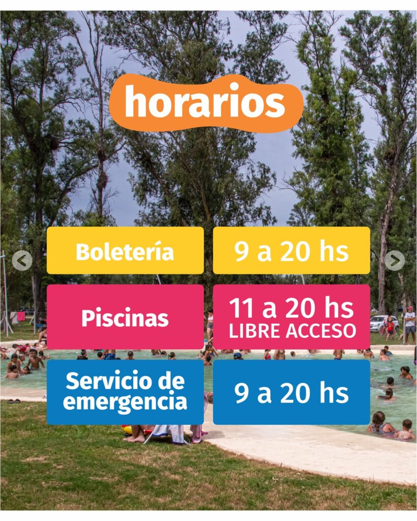 - 🏊♀️ Piletas dentro del predio (horarios 11 a 20 h).