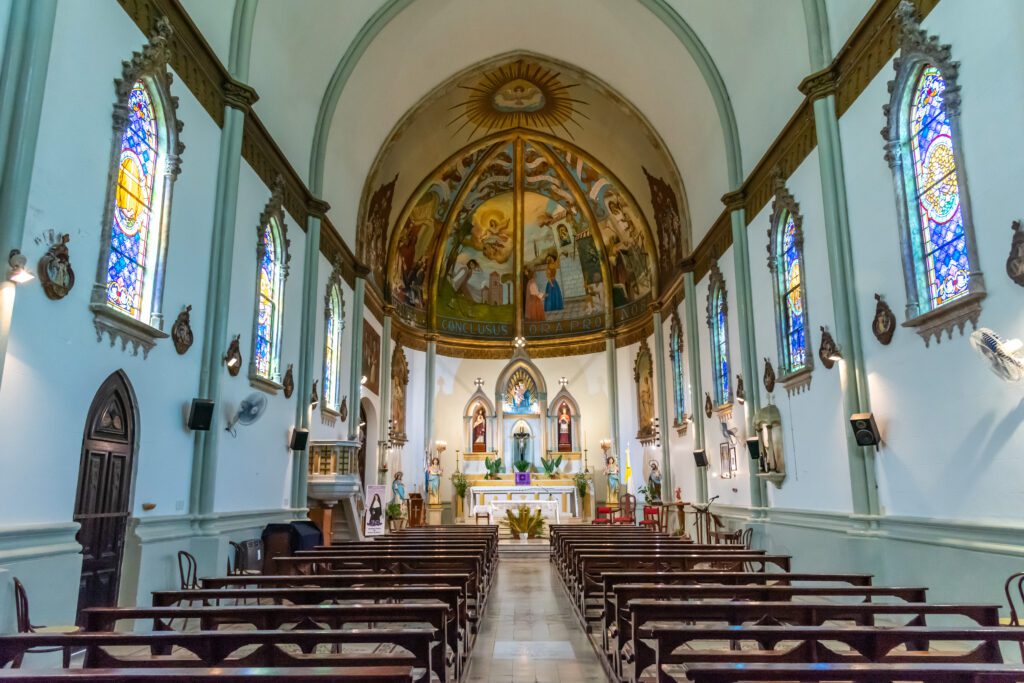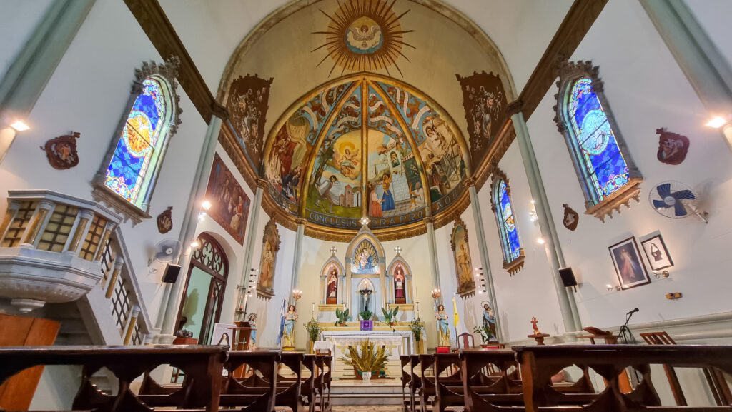 Las estatuas del presbiterio son: a la izquierda, la Inmaculada Concepción y a la derecha, el Divino Niño Jesús y San José.