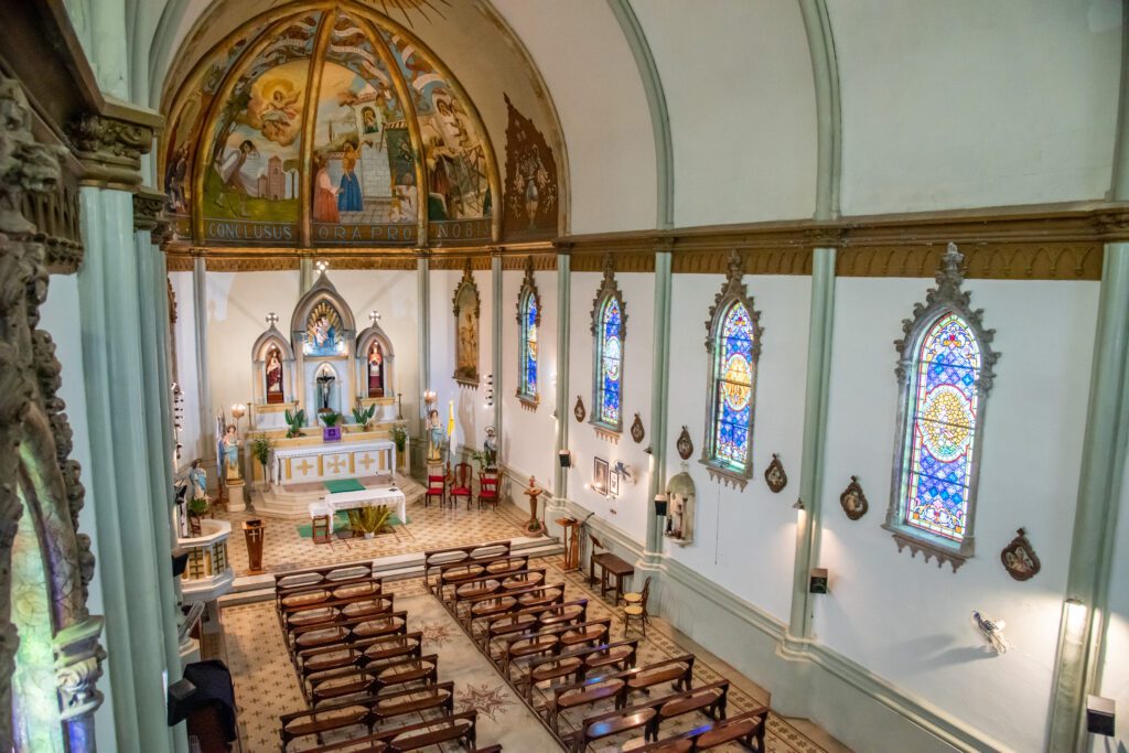 En las paredes laterales de la capilla podemos apreciar las 14 estaciones del Vía Crucis, talladas en madera. Los vitreaux muestran las expresiones religiosas tales como el Espíritu Santo, la Eucaristía y la Cruz, entre otras. En el vitreaux redondo situado arriba se aprecia el Sagrado Corazón de Jesús.