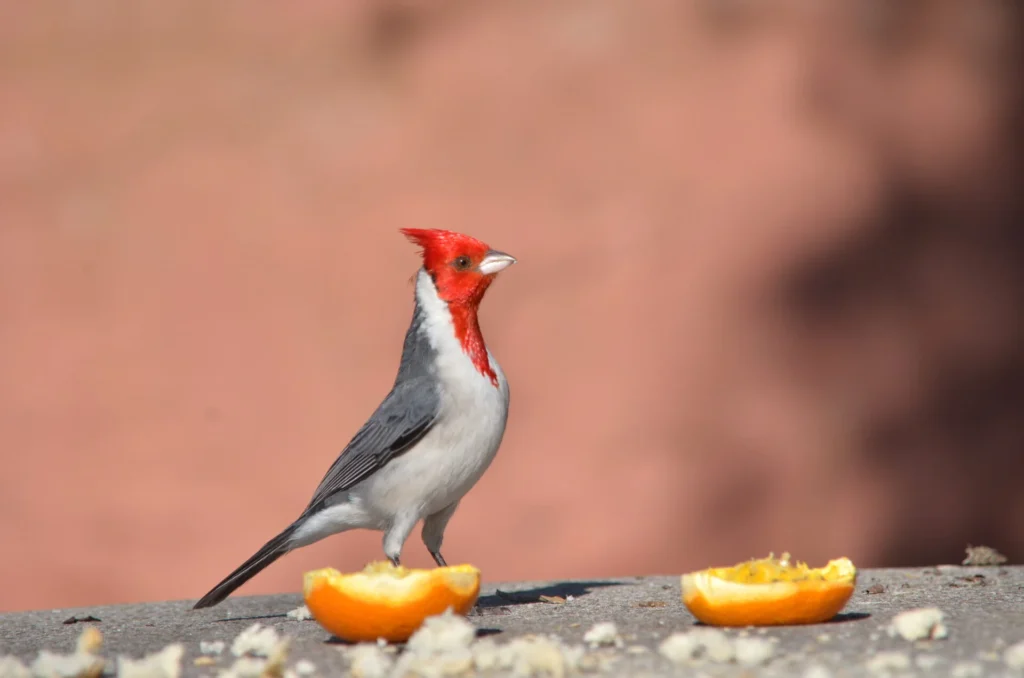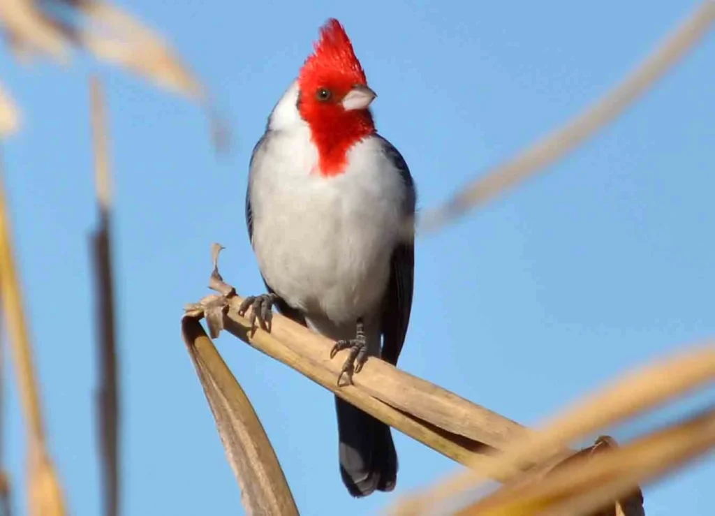 Su cabeza, copete, garganta y parte superior del pecho son rojos lo que lo hace muy llamativo, en los jóvenes el rojo es más opaco. El resto de la parte dorsal es gris. Pecho inferior y abdomen blancos en adultos y jóvenes. Anda en pareja y en el otoño e invierno en bandadas. Se posa en ramas de árboles o de arbustos. Busca alimento en el suelo. Por su agradable canto y por su belleza, es víctima del mascotismo.
