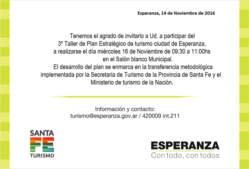 La Municipalidad de Esperanza, a través de la Dirección de Turismo de la Secretaria de la Producción, se encuentra abocada al desarrollo del Plan Estratégico de Turismo de la Ciudad de Esperanza, implementado a través la transferencia metodológica que plantean el Ministerio de Turismo de la Nación y la Secretaría de Turismo de la Provincia de Santa Fe, con una gran participación de las empresas e instituciones de la ciudad vinculadas al sector.
