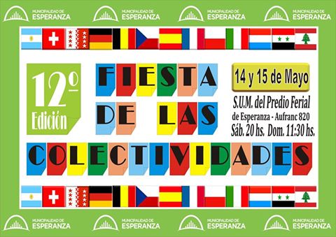 La Municipalidad de Esperanza -a través de la Secretaría de Cultura y Deportes- en forma conjunta con las Colectividades de la ciudad, se encuentran abocadas en la organización de la 12º Fiesta de las Colectividades a desarrollarse los días: sábado 14 de mayo -a partir de las 20- y el domingo 15 -a partir de las 11:30- en el amplio Salón de Usos Múltiples (SUM) del Centro de Industria, Comercio y Afincados de Esperanza (CICAE), a la vera de las calles Amado Aufranc (ruta 70) y Nicolás Schneider.
