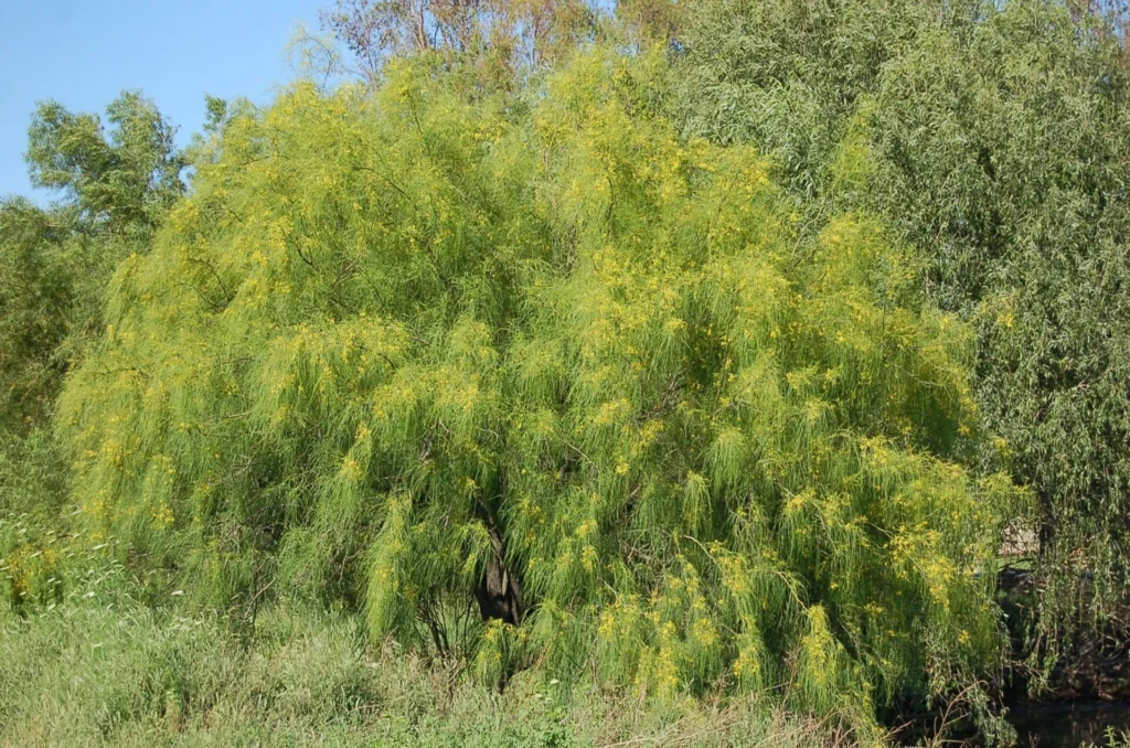 Llamado también palo verde o retama, árbol bajo, de follaje poco denso y flores amarillas con detalles rojos. Es muy frecuente en proximidades de arroyos y ríos. Soporta suelos salinos, sequías e inundaciones.