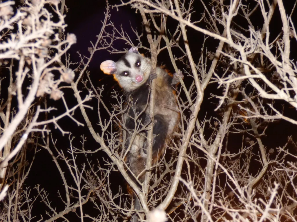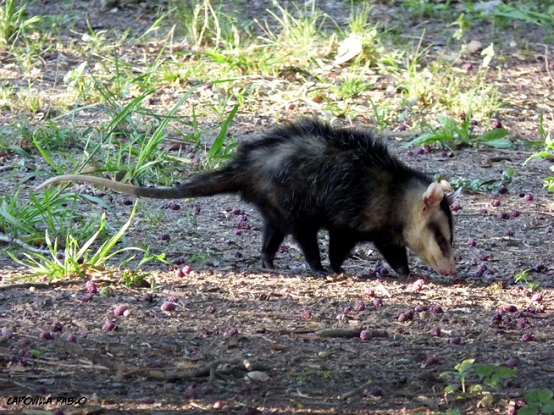 Llamada también zarigüeya, es un marsupial (como los canguros y koalas australianos). Habita solo en América del Sur. Esta especie ha sobrevivido a numerosos cambios ocurridos en el continente a lo largo de millones de años, sin variar mucho evolutivamente, por lo que podría ser considerada como un fósil viviente. Posee extremidades robustas con la particularidad que las 4 poseen manos desnudas con 5 dedos con pulgar oponible. Esta característica sumada a una cola prensil le permite trepar árboles con facilidad.