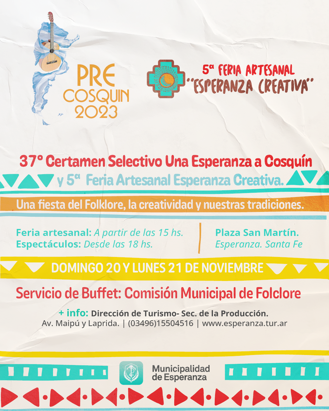 La Municipalidad de Esperanza se encuentra abocada a la organización de la 37º Edición del Certamen Selectivo “Una Esperanza a Cosquín” en el marco del “Pre-Cosquín 2023” y la 5ta. Edición de la Feria Artesanal “Esperanza Creativa”.