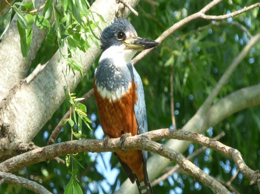 También llamado Matraca. Vive a orillas de arroyos, ríos, lagos y lagunas. Se lo observa de manera solitaria o en parejas. Para alimentarse se zambulle desde un posadero. Construye el nido en barrancas de tierra o arena. Pone de 3 a 5 huevos de color blanco que incuban tanto el macho como la hembra. En el mural podemos apreciar a la hembra, la cual tiene un plumaje distinto al del macho, donde predomina el azul en el pecho.