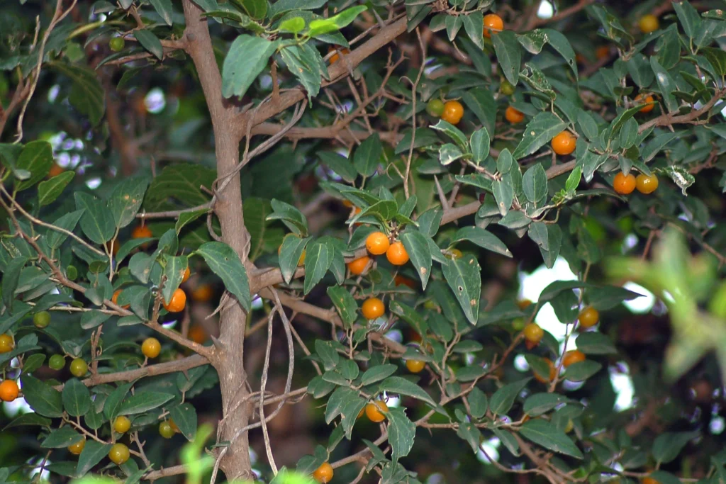 Tala (Celtis pallida): arbusto de ramas espinosas, con característica forma de zigzag. Tiene frutos pequeños, carnosos, color naranja, dulces y comestibles, que alimentan muchas especies de aves. Varias mariposas se relacionan estrechamente con esta especie.